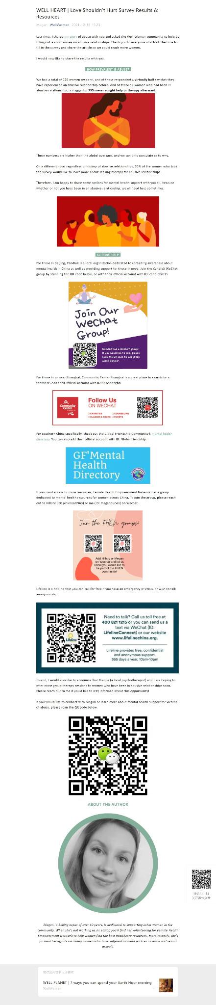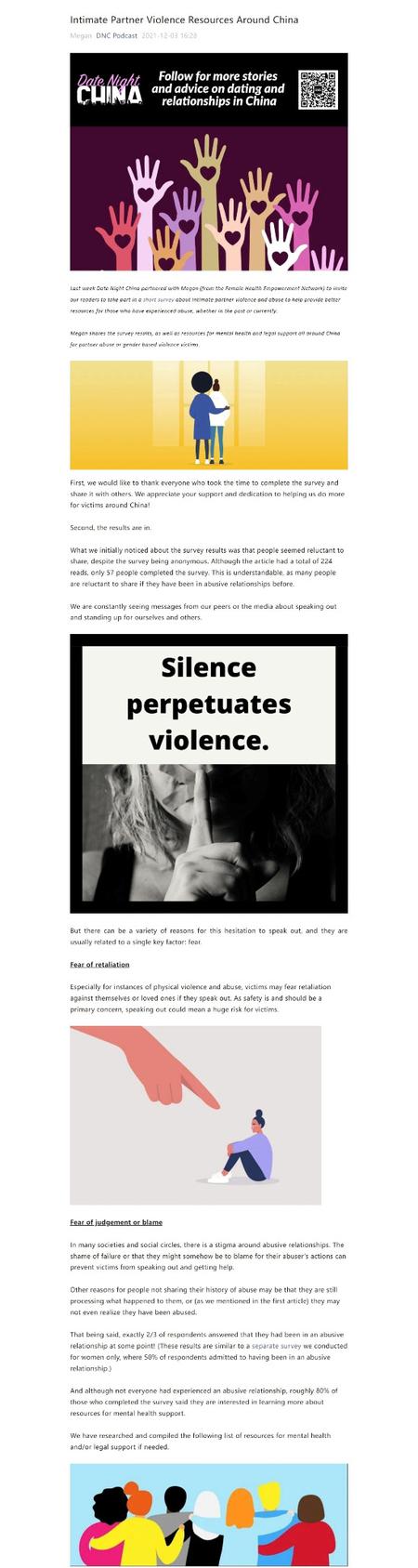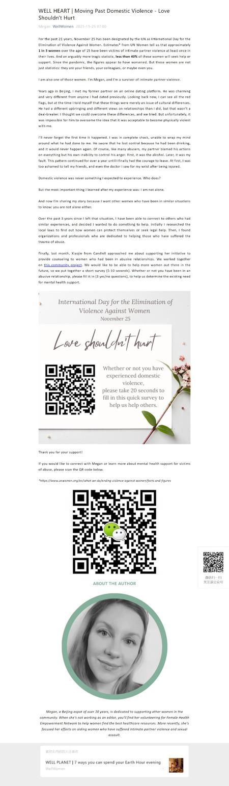 Over the course of 18 months from 2020 to 2021, I researched and created these in-depth guides for women in need. I took the initiative after I realized there were no existing sources of information in English for women who found themselves victims of violence. These documents have been widely circulated on Chinese social media platform WeChat and used by the US Embassy in Beijing, as well as other organizations and individuals who provide support to victims.
